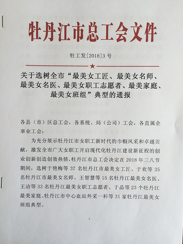 值此“三八”國際婦女節(jié)到來之際,牡安幗國相繼獲得牡丹江市總工會、牡丹江市婦女聯(lián)合會頒發(fā)各項殊榮。