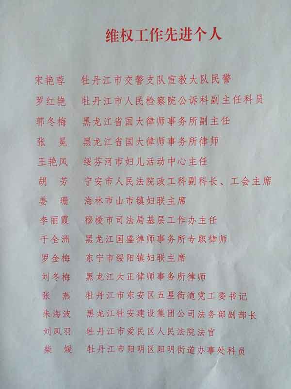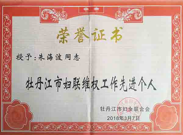 集團公司法務(wù)總副部長、機關(guān)支部書記朱海波,始終堅持把滿腔的熱情化作工作的動力,在公司工會的正確領(lǐng)導下,以維護女職工合法權(quán)益為主題,提高全體女職工素質(zhì)為目標,充分調(diào)動了廣大女職工的積極性、創(chuàng)造性,為構(gòu)建企業(yè)和諧發(fā)展做出了積極的貢獻。維護好女職工的合法權(quán)益和特殊利益,是婦委會基本職責和不可推卸的責任,積極開展權(quán)益保障行動,把維護女職工的合法權(quán)益作為一切工作的出發(fā)點和落腳點。關(guān)心困難女職工生產(chǎn)和生活情況,定期開展“愛心送溫暖”幫扶活動,并組織廣大女職工積極參與牡丹江市組織的“我為雪城添新綠”“關(guān)愛母親河”“金秋助學”“共享陽光關(guān)愛留守兒童”等系列公益活動,充分調(diào)動廣大女職工向社會伸出互助友愛之手,共同構(gòu)建牡安集團正能量愛心聯(lián)盟。她榮獲牡丹江市婦女聯(lián)合會“維權(quán)先進個人”光榮稱號。